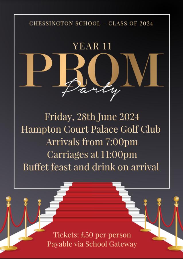 A Reminder to pay for prom on the 28th of June a Hampton Court Golf club It's an excellent event that ends their time at Chessington with a celebration.