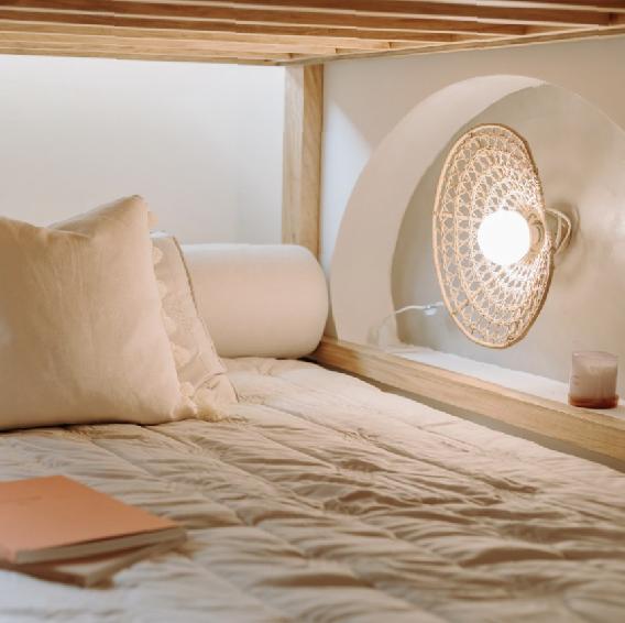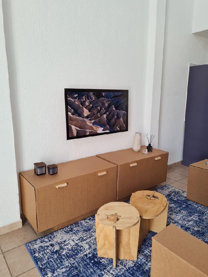 Diseñamos un ambiente funcional y acogedor, integrando muebles desmontables en cartón fabricados con tecnología CNC, lo que permite replicar este concepto en futuros apartamentos modelo de manera sostenible.
