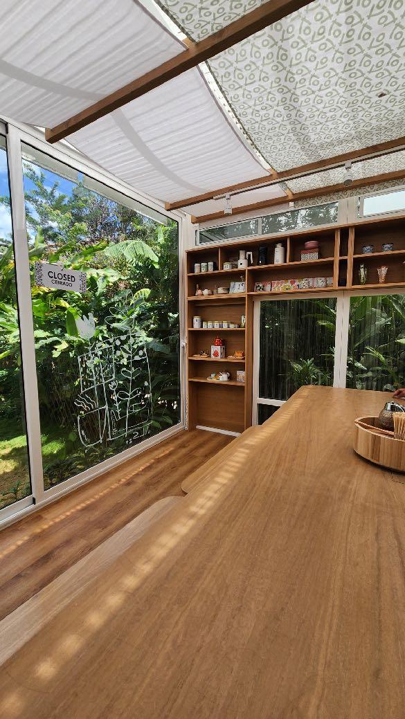 El diseño minimalista y los muebles destacan por su uso de transparencias y tonalidades naturales, conectando el exterior con el interior. Así, los visitantes se sumergen en un ambiente armónico que refleja la belleza del entorno y la atractiva de productos y gastronomía japonesa, ofreciendo un "pedacito de Japón" en medio de El Salvador.