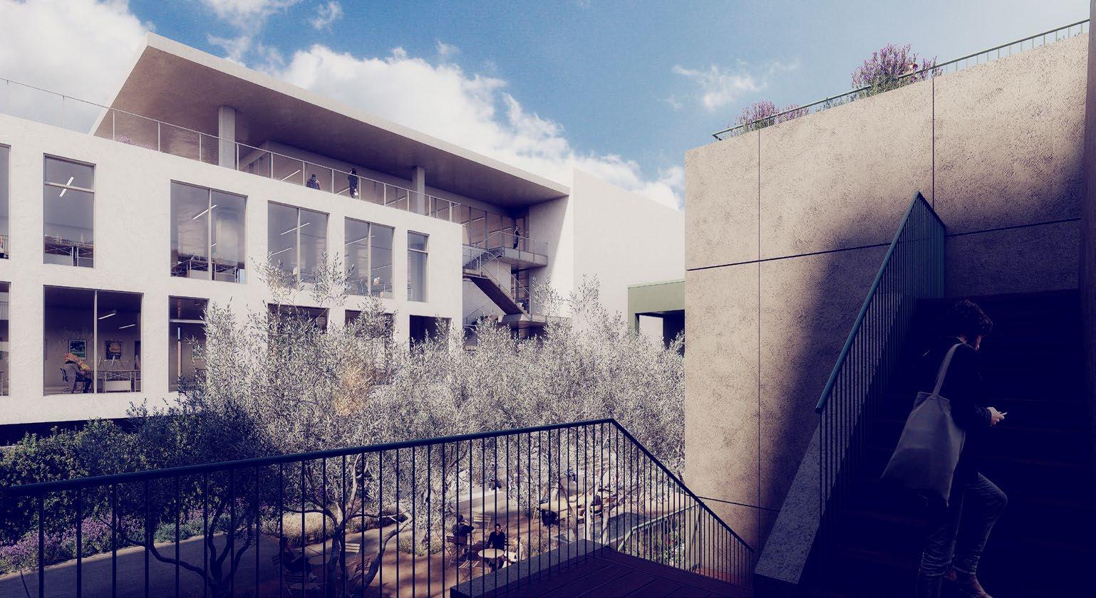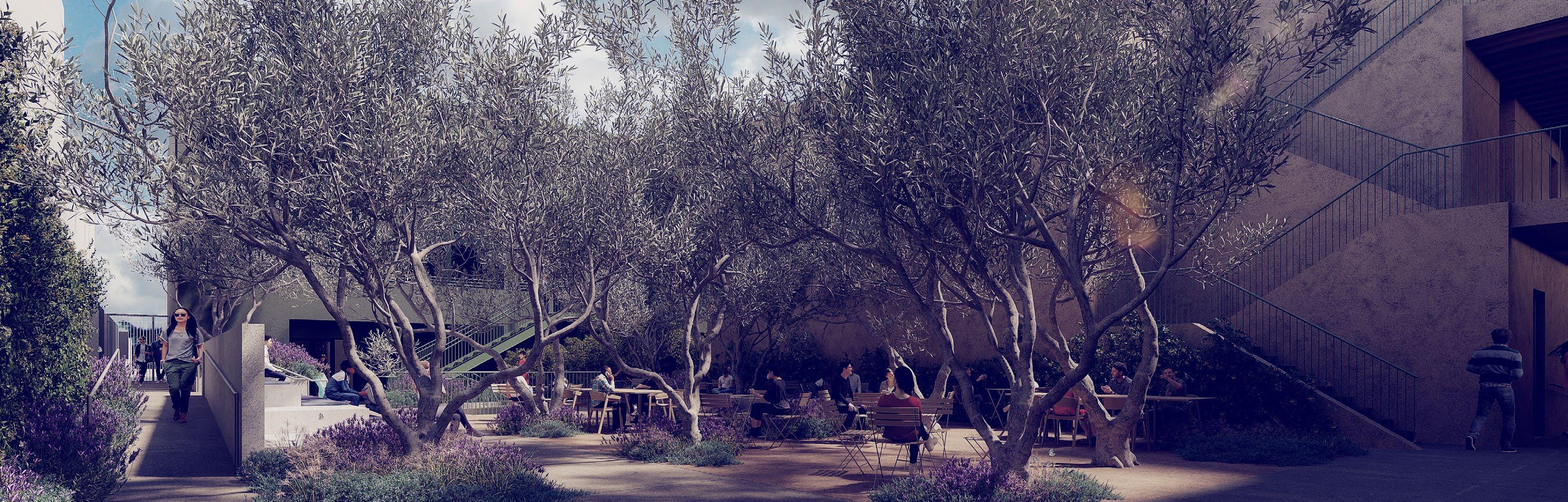 Beneath a canopy of mature oli�e trees, this landscaped courtyard in�ites quiet con�ersation and creati�e reset—connecting the buildings through light, texture, and shared experience.