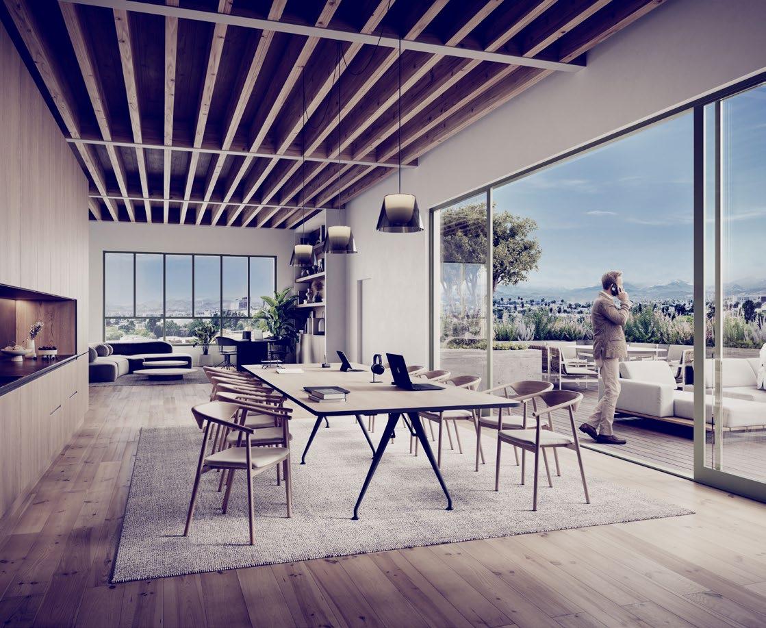 With exposed �ood ceilings, panoramic glazing, and seamless indoor-outdoor flo�, this �orkspace offers a �arm, modern backdrop for focused collaboration—opening directly onto a pri�ate terrace �ith s�eeping �ie�s of the Holly�ood Hills.