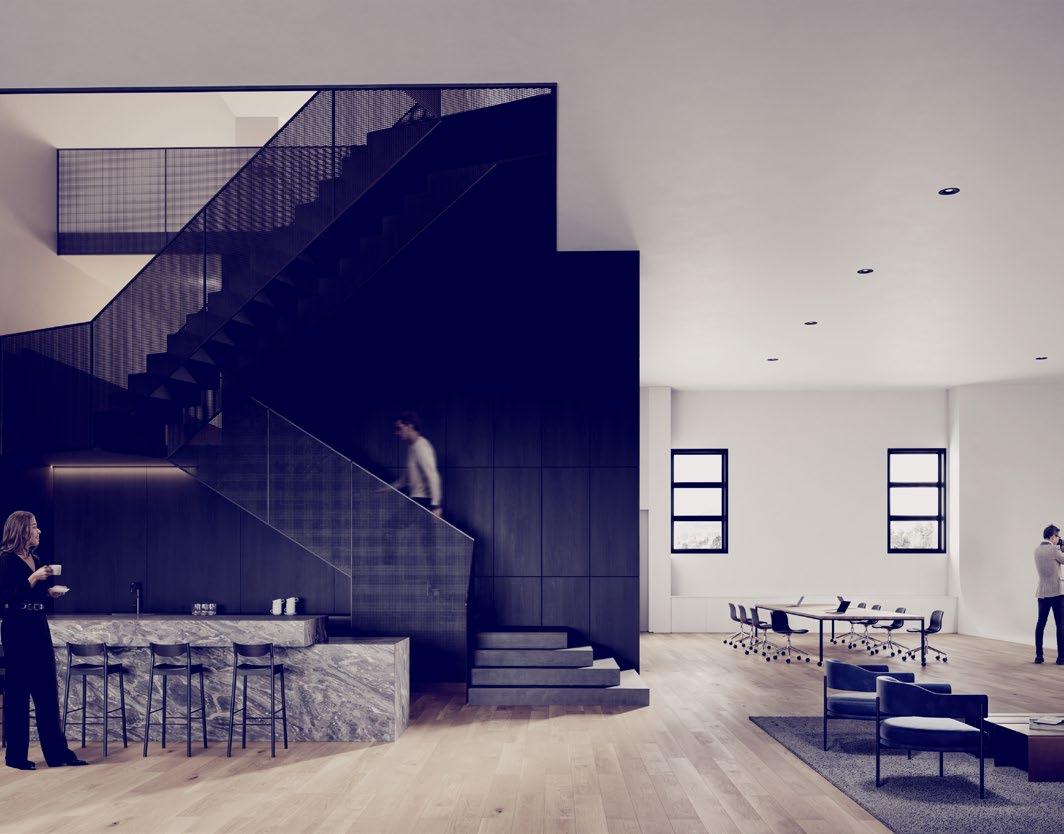 a more compact scale, with two levels and a mezzanine that balance efficiency and openness, perfect for creative teams with efficiency in mind. Building C stands apart with its uniquely intimate layout: smaller suites, exposed wood ceilings, private terraces, and elevated materiality provide a warm, refined environment for inspired work and deep thinking.