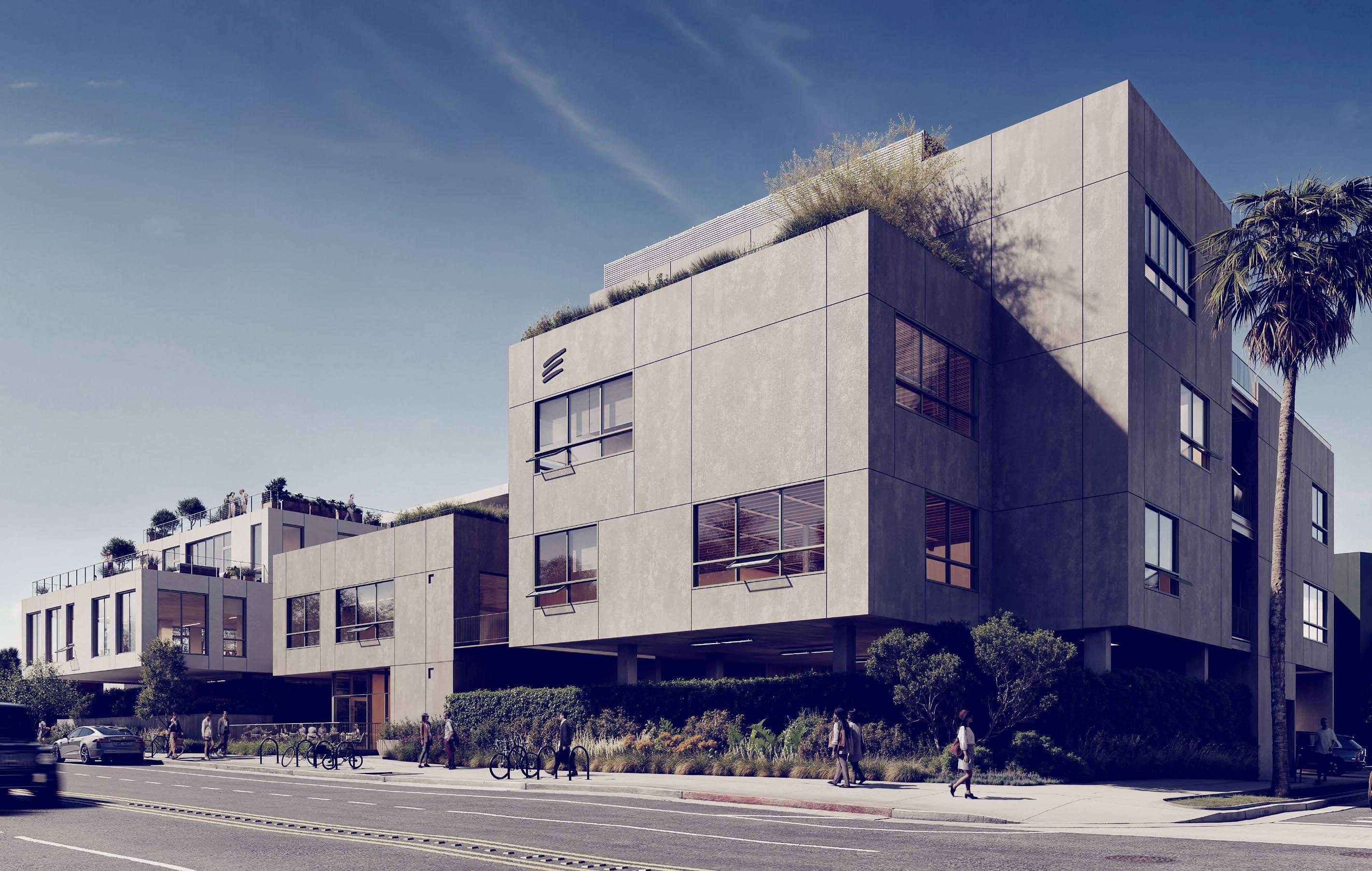 Building A is the largest of the trio—spanning three levels above private parking—with efficient floorplates, 14’ ceiling heights, and extensive private terraces ideal for dynamic, creative work environment. Building B offers a similar flow at