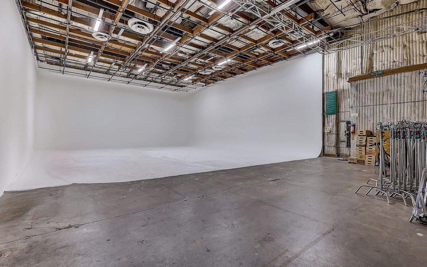 Large-scale production stage featuring a seamless �hite cyc �all, open concrete flooring, and a full grid ceiling �ith integrated lighting and rigging infrastructure. Designed to support film, tele�ision, photography, and commercial production.