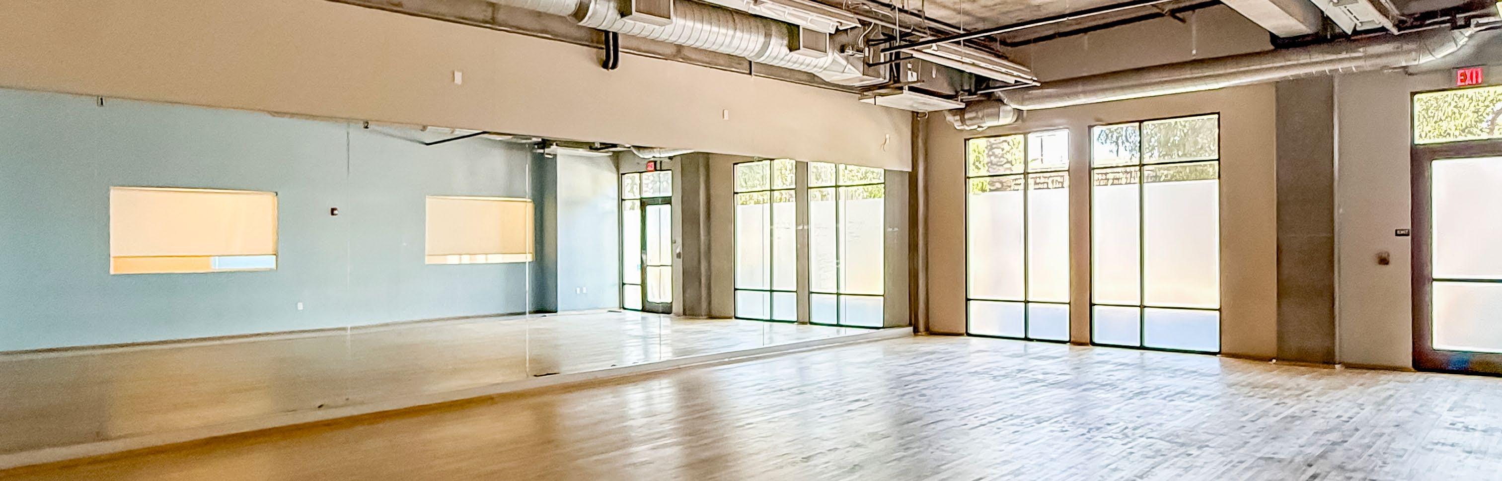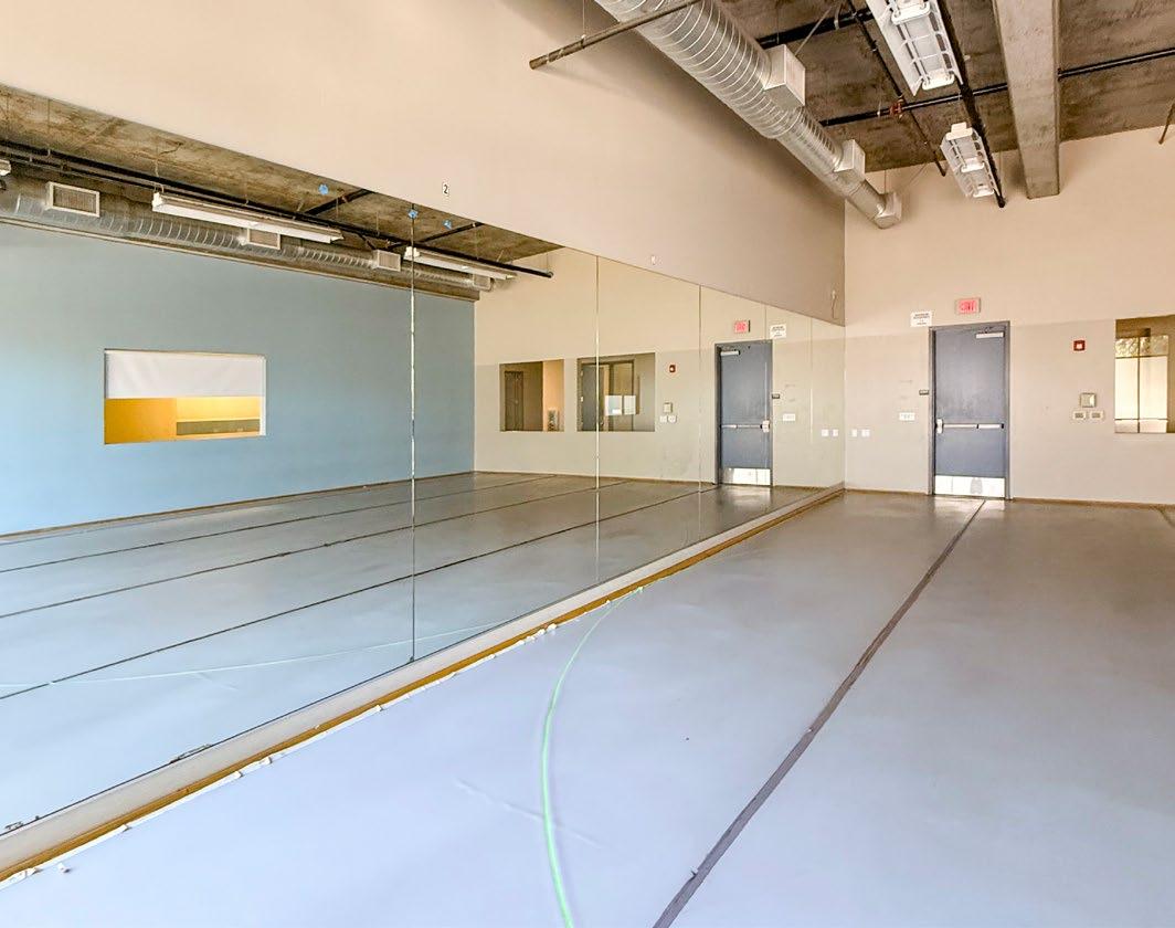 Flexible studio en�ironment �ith mirrored �alls and open floor area, ideal for smaller group classes, technique �ork, choreography sessions, or pri�ate instruction.