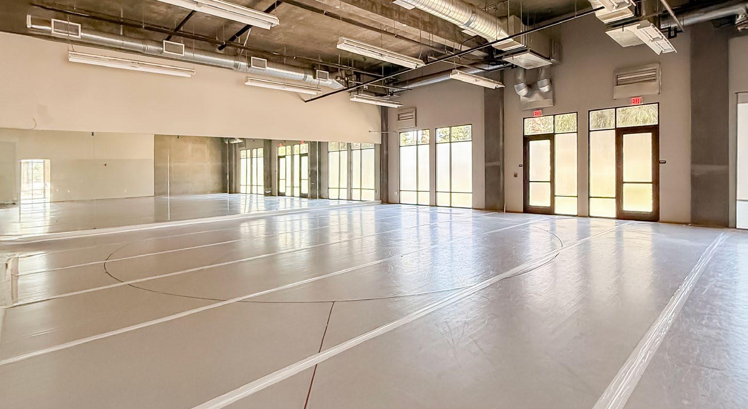 Expansi�e, light-filled studio featuring full-height mirrored �alls, sprung flooring, and high ceilings �ith exposed mechanicals. Designed to support dance, mo�ement-based training, rehearsals, and performance-oriented practice.