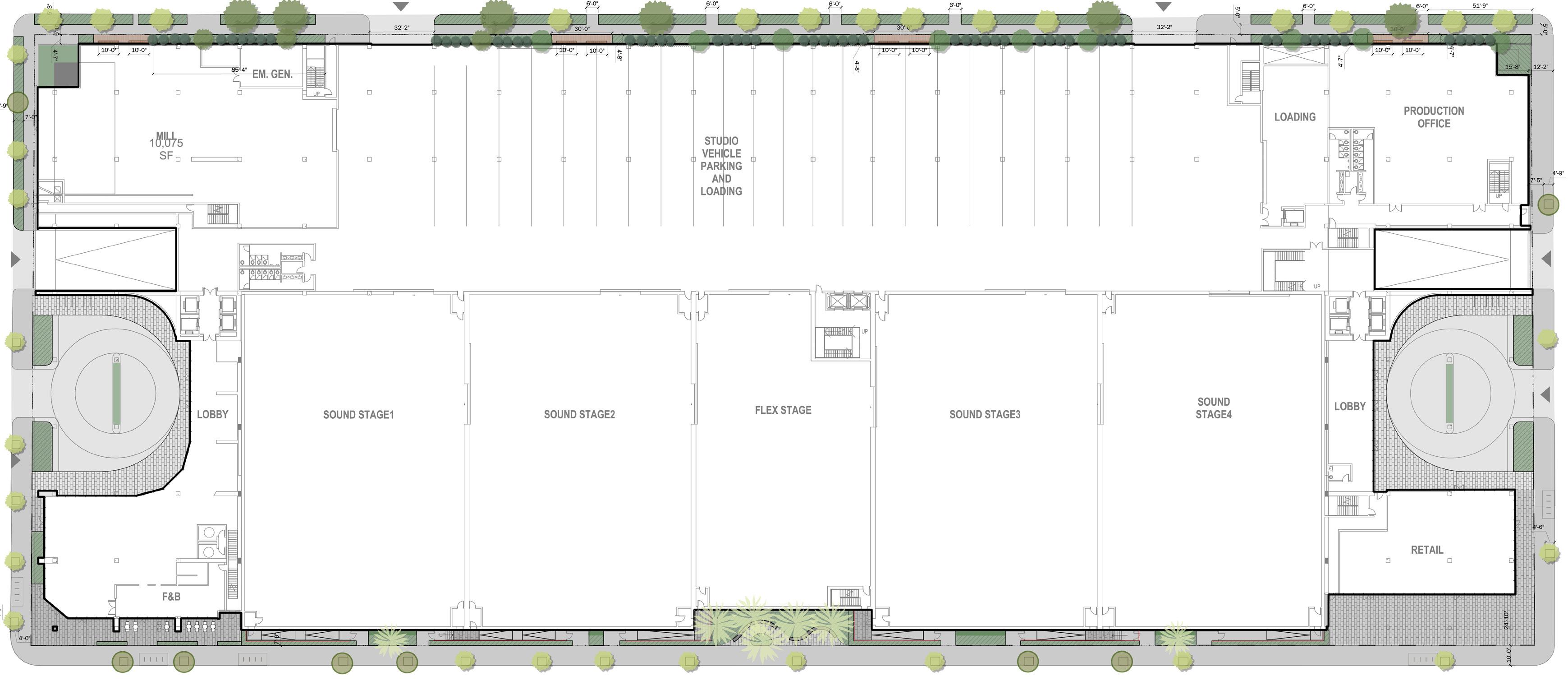 With production activities concentrated on the south lot, production will enter off of either Cahuenga Boulevard or Cole Street and have immediate access to the stages, additional loading, the mill, and production support space. Visitors and employees will enter the North or South lot from either street through a guarded and secure entry where they will be met by a valet attendant.