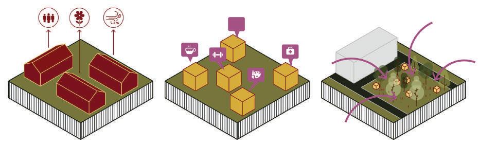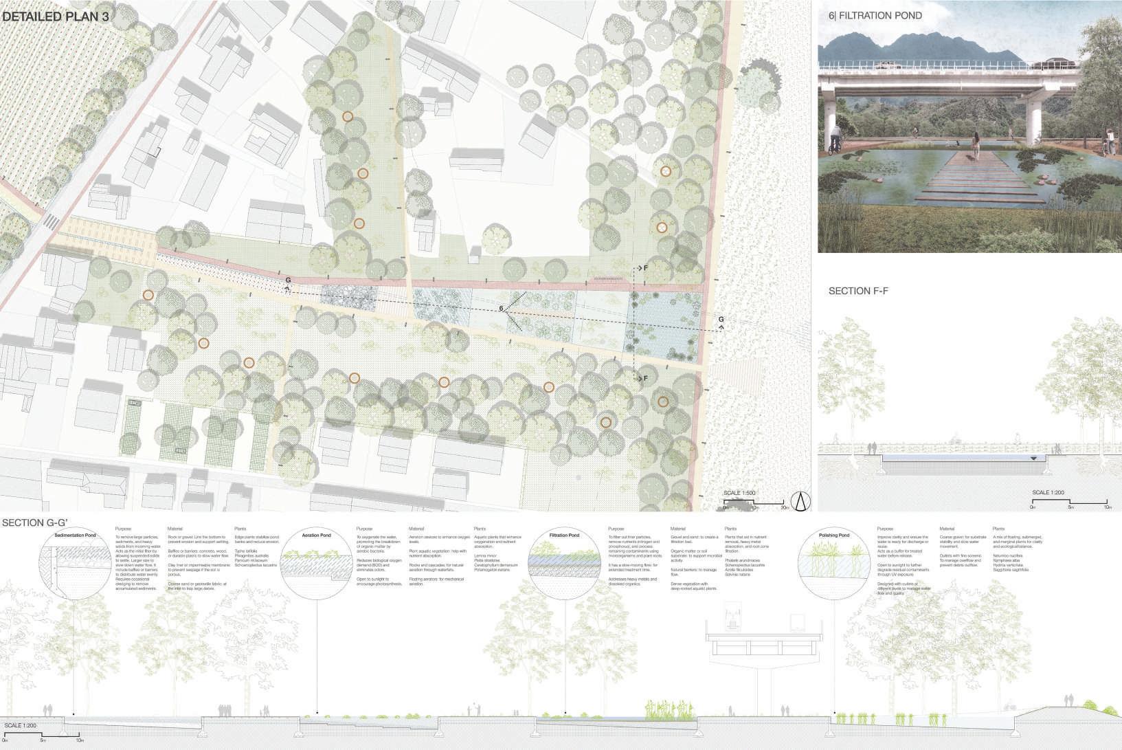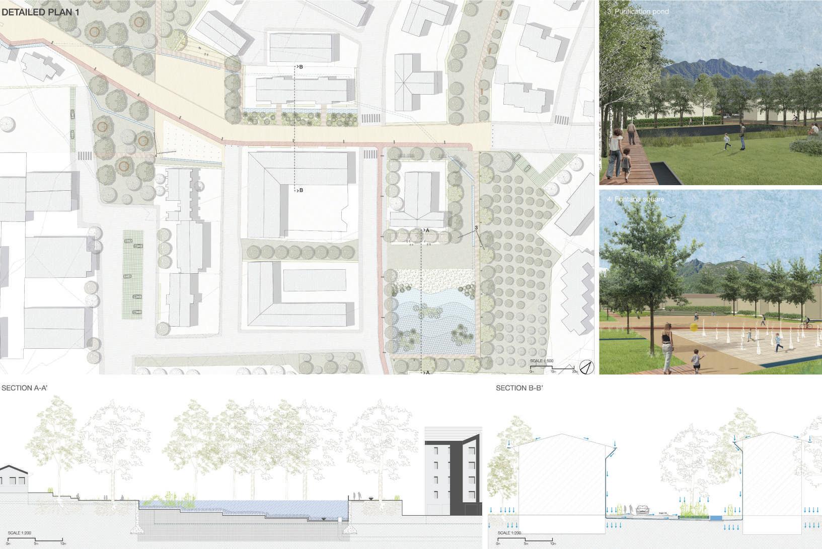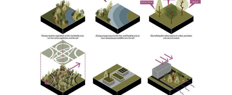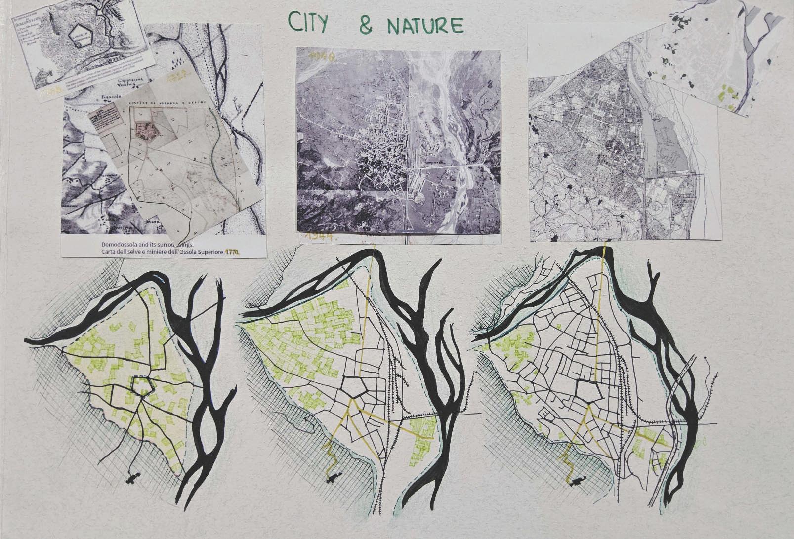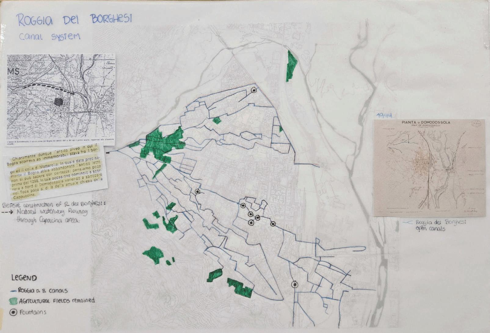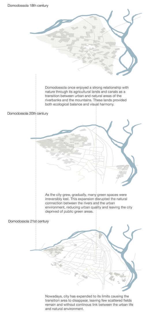 This project reimagines the historical Roggia dei Borghesi canal system as a vital thread reconnecting Domodossola’s natural and urban landscapes. Once buried and forgotten, the canal is revived as a central element that guides the transformation of the territory linking the Bogna stream to the Toce River. The first transect emphasizes the point where water re-enters the city, highlighting a productive landscape that transitions from urban agriculture to natural mountain terrain. Integrated water features, such as a phytoremediation pond, enhance the ecological and social value of open spaces, while a new pedestrian bridge reestablishes continuity across infrastructure barriers, connecting the city to a linear park shaped by the traces of a dismissed railway. The second transect celebrates the canal’s journey through the city’s southern edge, restoring lost agricultural fields based on historical land divisions to create a new agricultural park. A series of ecological ponds each with unique purifying functions treat the water before it reaches the Toce, enhancing biodiversity and landscape quality. Altogether, the project strengthens the environmental, historical, and experiential fabric of Domodossola, offering its inhabitants a renewed connection to place through water, nature, and memory.
