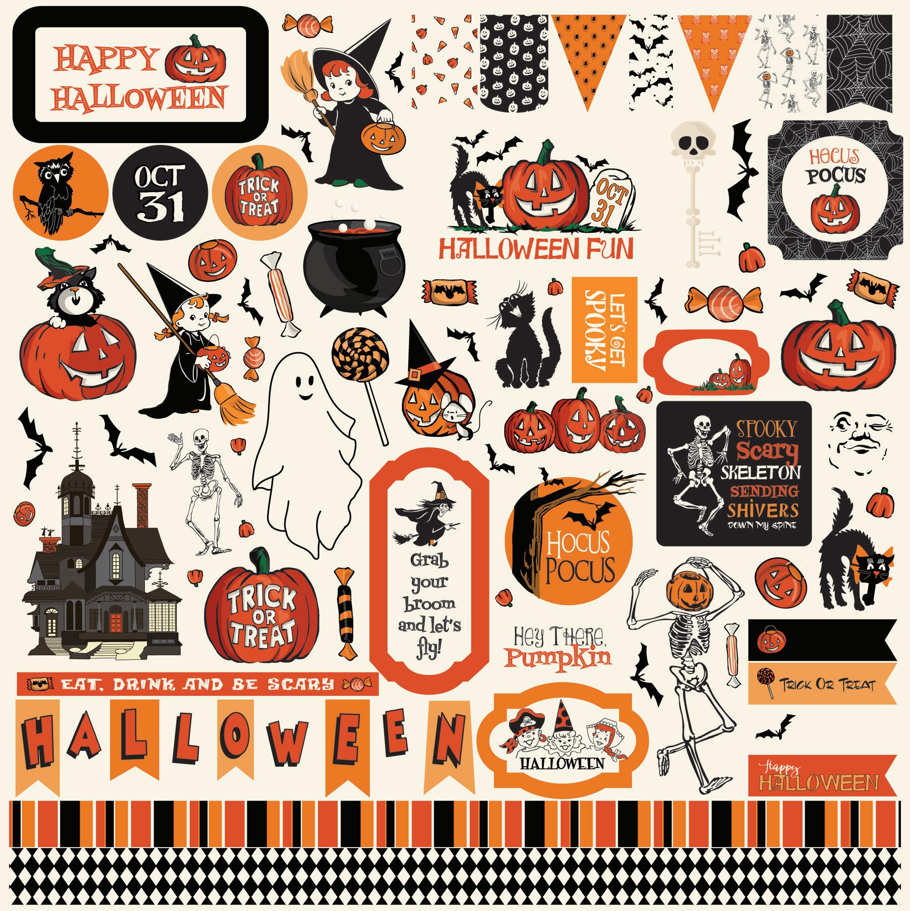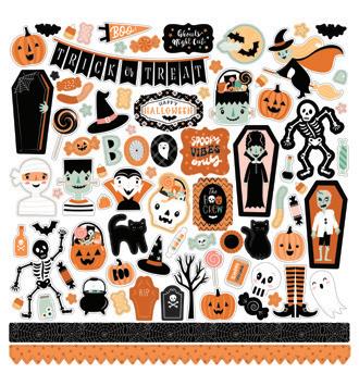 Featuring a distinctive palette of mint green and pink, along with the classic Halloween colors of black and orange, the “Spooktacular Halloween” collection is a whimsical and vibrant celebration of the spookiest season of all. Costumed characters, cheery skeletons, and vibrant trick-or-treat houses are showcased on the pages and embellishments throughout. The playful atmosphere is further explored with catchy phrases, cute coffins and costumed characters, all ready to help you create perfectly enchanting Halloween projects!