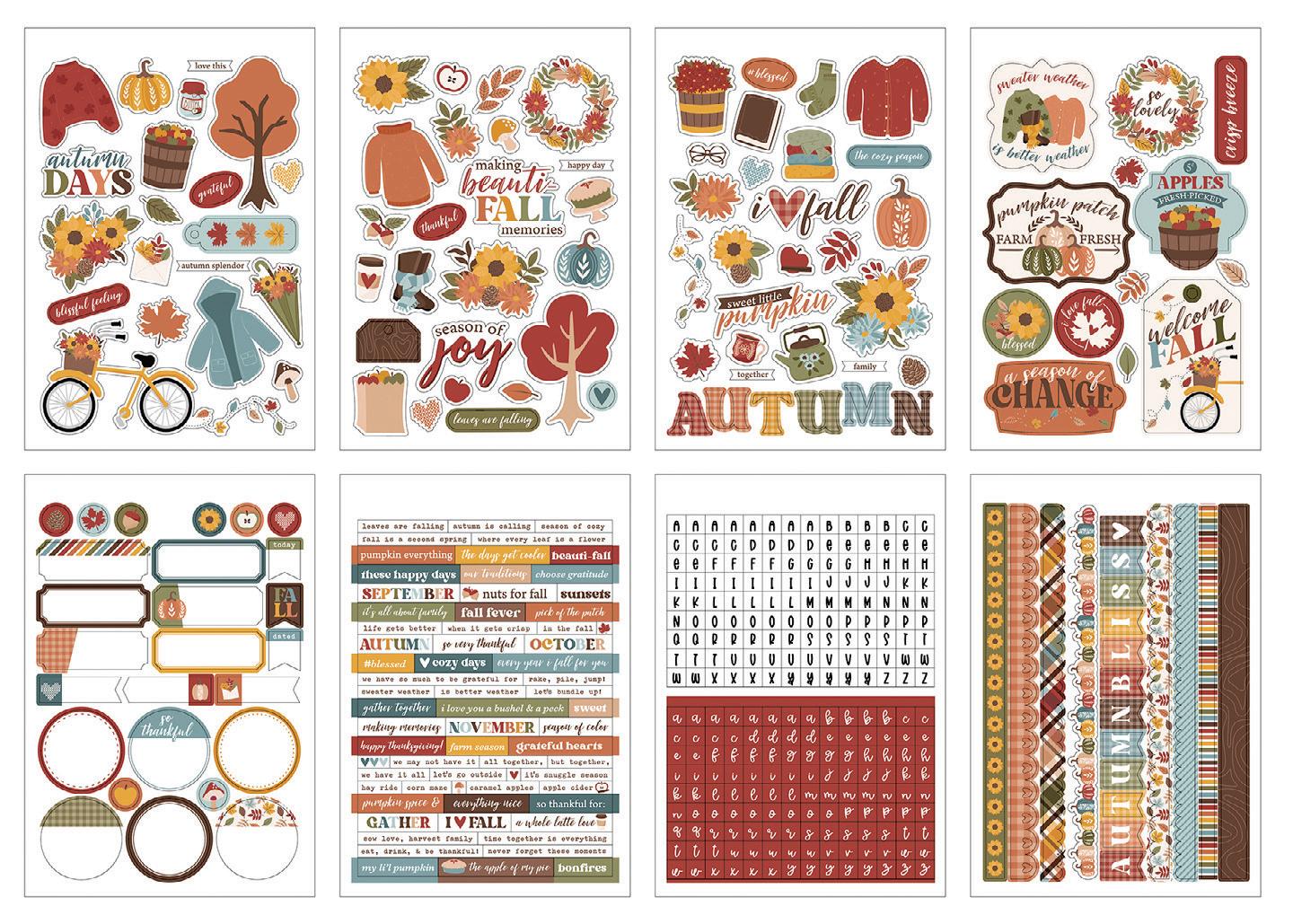 Fall-lelujah! If you love autumn as much as we do, you’re going to love our new “Sweater Weather” collection. This new set captures the essence of autumn through a delightful array of imagery, featuring vibrant leaves, radiant sunflowers, and comfy sweaters. Every page feels warm and cozy, with many adorned with plaids, ginghams, and stripes. Apples and pretty pumpkins add a festive touch, and everything is set against an autumnal color palette of warm oranges, rich browns, and golden yellows. This collection is complemented by heartfelt quotes and phrases celebrating fall, family, and thankfulness, making it a perfect tribute to the beauty of the season.