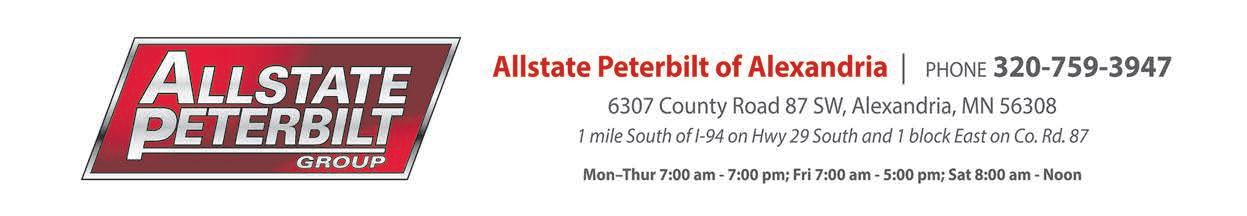 ALEXANDRIA, MN | BISMARK, ND | CLEAR LAKE, IA | DICKINSON, ND | EAU CLAIRE, WI | FARGO, ND | GRAND FORKS, ND | JAMESTOWN, ND | LA CROSSE, WI | MANKATO, MN | RAPID CITY, SD | RICE LAKE, WI | ROCHESTER, MN | ROGERS, MN | SAUK RAPIDS, MN | SOUTH ST. PAUL, MN | SUPERIOR, WI | TOMAH, WI | WATERTOWN, SD | WILLISTON, ND | WINONA, MN allstatepeterbilt.com