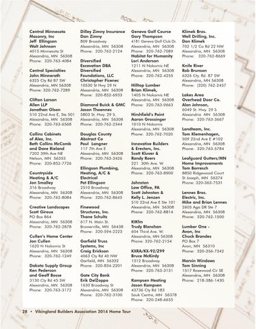 Central Minnesota Masonry, Inc Jeff Ellingson Walt Johnson 4015 Minnesota St Alexandria, MN 56308 Phone: 320-763-4084 Central Specialties John Minnerath 6325 Cty Rd 87 SW Alexandria, MN 56308 Phone: 320-762-7289 Clifton Larson Allen LLP Jonathan Olson 510 22nd Ave E, Ste 501 Alexandria, MN 56308 Phone: 320-763-6568 Collins Cabinets of Alex, Inc. Beth Collins McComb and Dave Rieland 7202 39th Ave NE Nelson, MN 56355 Phone: 320-852-7726 Countryside Heating & A/C Jon Smalley 316 Broadway Alexandria, MN 56308 Phone: 320-762-8084 Creative Landscapes Scott Giroux PO Box 864 Alexandria, MN 56308 Phone: 320-762-2878 Cullen’s Home Center Jon Cullen 1620 N Nokomis St Alexandria, MN 56308 Phone: 320-762-1249 Dakota Supply Group Ken Pederson and Geoff Bosse 3130 Cty Rd 45 SW Alexandria, MN 56308 Phone: 320-763-3172