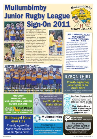Mullumbimby JRLFC welcomes both old and new players to the 2011 season. Come along and sign up for a season of fun and great footy with the Mullumbimby Junior Giants. All grades from u7 to u16. Cost of registration is $100 which includes insurance, club shirt, shorts and socks. New players signing on must bring their birth certificate and 3 current passport-size photos. All chil dren must be accompanied by their parent or carer. Payment must be made in full on the day. Enquiries to: President, Steve Brooke 0412 229 274 Secretary, Jan Savage 6680 4216