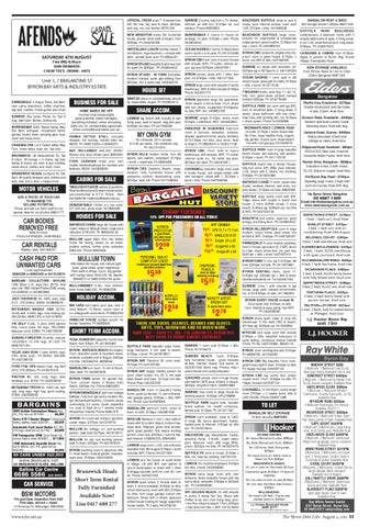 THERE ARE SOCKS, SCARVES, BEANIES AND GLOVES. GIFTS, TOYS, HARDWARE AND SO MUCH MORE. Â&#x2021; 6+23 ² -21621 67 %<521 %$< NEXT DOOR TO DENDY CINEMA ENTRANCE. SUFFOLK PARK beautiful large home, large backyard, 2 min walk to beach, $135pw + bond. Ph 0407678821 BYRON BAY Paterson St, room avail, $150pw. Ph 0431337060 BYRON BAY happy, healthy person for quiet, clean house, n/s, d/f, 5 min walk Main Beach and town, $141pw incl bills. Phone Peter 0422022097 BANGALOW room in beautiful family home, quiet cul-de-sac, f-f, own entrance, own garage space, $160pw + bills, WiFi incl. Phone Lisa 0429878902 BANGALOW part-furn room, close to town, no bills, $139pw. 0402281638 MYOCUM Mevlana 2 rms + own bathrm share with 52 yo fem. Beaut, modern hse, large deck, ďŹ replace, great view, private, quiet, great garden. Suit aware working person, avail now, $200pw + bond & exp, fast internet. 0438845235, 66846496 LENNOX large room, LUG, own entrance available from 8th August $195pw + bond includes WiFi. Phone 0412311824 LENNOX airy 3br house on quiet street in village, 1br with BIR, own bathrm & use of study/spare, to share with 1 other & shaggy spoodle, pref n/s, over 25, I am 40. Phone 0405421458 BYRON quiet street 2 minute walk to town, 2 rooms available; $160pw no bills, unfurn tiled sunny room with BIR; $140pw no bills, furn large garage turned into bedroom. Share with 3 others, spacious chilled house looking for happy respectful house mates. Ph Casey 0403738733