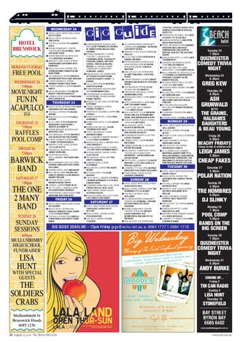 TUESDAY 30 Q HOTEL GREAT NORTHERN, BYRON HARRY HEALY Q BEACH HOTEL, BYRON 7PM QUIZMEISTER COMEDY TRIVIA NIGHT Q THE RAILS, BYRON 7PM MICK MCHUGH DUO Q WOODY'S SURF SHACK, BYRON SKYDIVE GIVEAWAY W DJ DALLAS Q CHEEKY MONKEYS, BYRON COYOTE UGLY TABLETOP DANCERS Q OWL & PUSSY CAT, BYRON TASTE OF OPC Q BANGALOW HOTEL 7.30PM BRACKETS & JAM Q NEW BRIGHTON FARMERS MARKET 9AM MICK MCHUGH Q LISMORE CITY BOWLO 8PM KIRK L’ORANGE BAND