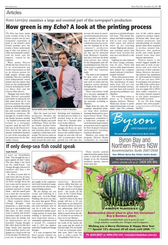 tion of the carbon inputs required to produce vegetable-based inks (from agricultural production and manufacturing) are actually greater than those required to produce mineral inks. Moreover, they perform poorly and create greater printed waste than their mineral alternatives. ‘Printed matter is the world’s biggest landfill element and, as such, its producers and users must be conscious of their responsibilities. However, the printing industry has minimised its environmental footprint by 95 per cent since 1990. A newspaper now produces one-fifth of the carbon dioxide emitted by the production of a single CD or DVD. And, unlike computers or the power stations required to run them, newspapers are readily recycled.’ To see The Echo being printed visit www.youtube. com/watch?v=ICZvm Me9lYs