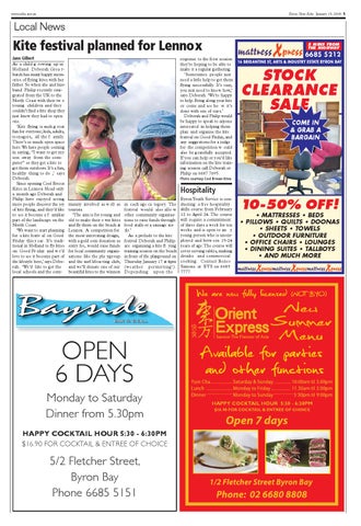 response to the fi rst session they’re hoping to be able to 16 BRIGANTINE ST, ARTS & INDUSTRY ESTATE BYRON BAY make it a regular gathering. ‘Sometimes people just need a little help to get them flying successfully. It’s easy, you just need to know how,’ says Deborah. ‘We’re happy to help. Bring along your kite or come and see ho w it’s done with one of ours.’ Deborah and Philip would be happy to speak to anyone COME IN interested in helping them & GRAB A plan and organise the kite festival on Good Friday, and BARGAIN any suggestions for a judge for the competition w ould also be g ratefully accepted. If you can help or you’d like information on the kite training session call Deborah or Philip on 6687 7695.