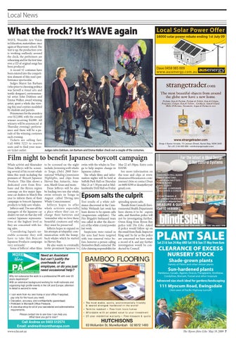 What the frock? It’s WAVE again WAVE, Wearable Arts Vision in Education, materialises once again at Shearwater school. The tent is up, the production crew is working endlessly around the clock, the performers are rehearsing and for the first time ever a CD of original songs has been produced. A record 52 costumes have been entered into the competition element of this year’s performance spectacular. Judges Mayor Jan Barham (who prior to choosing politics was herself a visual arts and textile designer), environmental artist John Dahlsen and Emma Walker, award winning artist, spent a whole day viewing this year’s entries modelled by students and parents. Prizemoney for the awards is over $12,000, with the overall winner receiving $4,000. All winners will be announced at Thursday evening’s performance and there will be a parade of the winning costumes each evening. Tickets are selling fast. Call 6684 3223 to reserve seats and to find your nearJudges John Dahlsen, Jan Barham and Emma Walker check out a couple of the costumes. est ticket outlet.