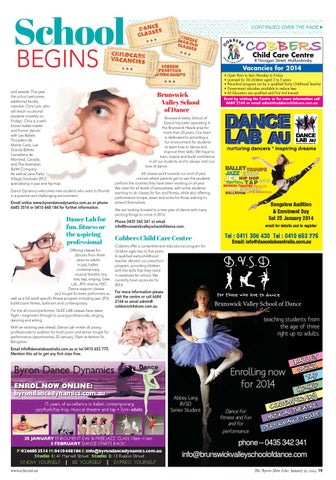 25 JANUARY ENROLMENT DAY & FREE JAZZ CLASS 10am –11am 3 FEBRUARY DANCE STARTS BACK! P: 02 6685 3514 M: 0410 448 184 E: info@byrondancedynamics.com.au Studio 1: 41 Marvell Street Studio 2: 13 Ruskin Street