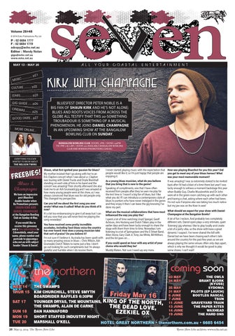 I never started playing music with the expectation that How was playing Bluesfest for you this year? Did people would like it, so I’m just happy that people are you get to meet any of your blues heroes? What enjoying it. was your most memorable moment? As a young blues musician, what do you believe It was amazing! I was so extremely stoked to be invited that you bring that is new to the genre? back after I’d had a blast of a time there last year! I was lucky enough to witness a moment backstage this year Speaking of compliments, one that I have often received from people after they’ve seen me play for when Buddy Guy, Charlie Musslewhite and Dr John the first time is: ‘I wasn’t a big fan of blues, but I like were all in the green room catching up with each other what you do’. If I can introduce a contemporary style of and having a chat, asking where each other had been. blues to punters who have never indulged in the genre I’m not sure if anyone else was taking too much notice and they enjoy it then I can leave the gig knowing I’ve but my jaw was on the floor in awe! done my part. What are the musical collaborations that have most What should we expect for your show with Daniel Champagne at the Bangalow Bowlo? influenced the way you play the?