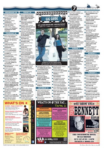 BYRON DEATH OF DESA MANI, DAVE DOG ATKINS, HEAVY B AND THE BOY, PAT TIERNEY JAKE KEMP Q GINGER PIG, BYRON Q BEACH HOTEL, BYRON 5PM NOMBREROS JOHN FOG & FRIENDS Q BYRON BREWERY 7PM 9:30PM SAFIA OPEN MIC NIGHT Q RAILWAY HOTEL, BYRON Q T WIN TOWNS, TWEED NATHAN KAYE KOLLECTIVE HEADS 11AM THE BUBLE Q BYRON COMMUNITY EXPERIENCE W GREG THEATRE 8PM ARJ BARKER ASPELING Q NORTHERN RIVERS WRITERS CENTRE 5.30PM THE BOY THURSDAY 29 IN THE YELLOW DRESS BY VICTOR MARSH Q GREAT NORTHERN HOTEL, BYRON THE SWAMPS Q GINGER PIG, BYRON FROTHING DJS Q BEACH HOTEL, BYRON 8PM HIT THAT HIT MUSICAL Q CAFE OSKA, BYRON 7PM BINGO BALEARIC FUNK Q COCOMANGAS, BYRON Q RAILWAY HOTEL, BYRON DJ QC CHRIS HOLLIDAY Q BYRON BREWERY 6PM Q GINGER PIG, BYRON BOOM FAYA ROB BANGO Q WOODY'S SURF SHACK, Q WOODY'S SURF SHACK, BYRON 8PM DJ JON BYRON CLUB RAIDERS Q T REEHOUSE, BELONGIL Q COCOMANGAS, BYRON 7.30PM LITTLE WISE W DJ JIMMY D MEGAN BERNARD Q BYRON BREWERY 7.30PM Q PIZZA PARADISO, SUFFOLK COCKATOO PAUL PARK 6.30PM CASSIE ROSE Q WOODY'S SURF SHACK, Q B ANGALOW HOTEL 7.30PM BYRON CLUB RAIDERS THE HOLIDAYS Q TREEHOUSE, BELONGIL Q MULLUMBIMBY EX7.30PM PAT TIERNEY W SERVICES 7PM TONY HAJI BASSIM SIERRA'S LIVE LATIN BAND Q BRUNSWICK HOTEL 7.30PM Q OCEAN SHORES TAVERN MILAN MARTIN 8PM ELEMENTAL DJS Q COURT HOUSE HOTEL, Q BILLINUDGEL HOTEL 8PM MULLUMBIMBY UKE'S KHANAGE SUMMER OF LOVE Q CLUB LENNOX 6.30PM Q BALLINA RSL 8PM BIG GIG DJ MAX PERROT COMEDY W SAM MCCOOL, Q BALLINA RSL 8.30PM MANDY NOLAN & PAUL ROCHELLE LEES BAND, NEW MCMAHONCOX GROOVE JAZZ ENSEMBLE Q SLIPWAY HOTEL, BALLINA Q ELTHAM HOTEL 7PM 7PM JON J BRADLEY STEPHEN LOVELIGHT Q STAR COURT THEATRE, Q GOLLAN HOTEL, LISMORE LISMORE 7PM PROTECTING DIANA ANAID BENTLEY BENEFIT W TONI Q EAST LISMORE BOWLING CHILDS & KERRIANNE COX CLUB 8.30PM SKY DADDY & LAURA TARGETT DUO Q TATTS HOTEL, LISMORE 7PM Q NIMBIN HOTEL 7.30PM VICTIMS OF GEOGRAPHY SKINWALKERS BAND Q NIMBIN HOTEL 6.30PM Q UKI HALL 8PM TIJUANA LEZ KARSKI CARTEL & DJ PULSE Q FINS, KINGSCLIFF BAY FM Q KINGSCLIFF BOWLS CLUB DINNER CLUB FUNDRAISER RICHIE WILLIAMS DUO Q COOLANGATTA HOTEL Q SALTBAR, KINGSCLIFF KING OF THE NORTH 8.30PM NICKY CONVINE BYRON AYSHA & DR BAZ
