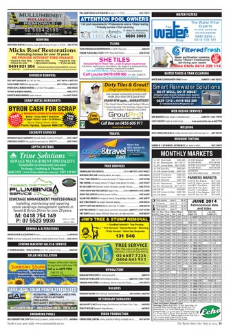 TREE SERVICES SUMMERLAND TREE SERVICES .............................................Call Tim 66877677 or 0417 698227 NORTHERN TREE CARE Consulting arborist, tree surgery ...........................................0414 186161 7 TILL 7 TREE SERVICES Tree removal & pruning & 15” chipper-crane truck ..............0427 347380 TREE CONTROL Safe lopping, removal, 12” chipper, stump grinder. Free quotes ..........0422 767677 OUT ON A LIMB Professional tree services. Free quotes. Low rates. Ph Lucas................0402 191316 A VERY HANDY MAN TREE SERVICES Happy to help ............Andrew 66844634 or 0412 558890 BYRON TREE SERVICES Qualified, insured. Call Alex ..................................................0402 364852