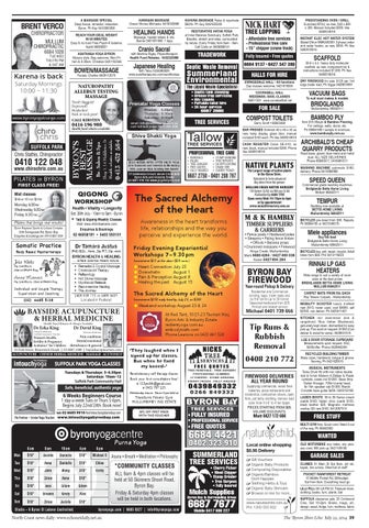 BYRON HEALTH & HEALING ... where science meets nature • Remedial & Crystal Massage • Craniosacral Therapy • 9LÅ L_VSVN` • Hot Stone Massage • Myofascial Release • Reconnective Healing • The Journey 0408 858 735 or 6688 4651 Located in Federal
