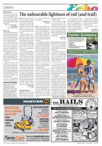 The unbearable lightness of rail (and trail) Q High hopes for a dedicated cycle and walking corridor for the thousands of older users who do not wish to dice with traffic but want to maintain fitness. How we would welcome the chance to use bikes to access beaches, music, markets and friends along the way. Please remember we are looking at a wider picture than Byron and its incomprehensible traffic mayhem. Communities in Casino, Lismore, Eltham Valley, Binna Burra, Bangalow would jump at the chance to revive this priceless corridor and generate tourism opportunities along the way. Onwards from Mullumbimby to Murwillumbah the stunning scenery would be a world-class attraction that would rival other similar trails in WA and NZ. Let’s get behind the NRRT and move