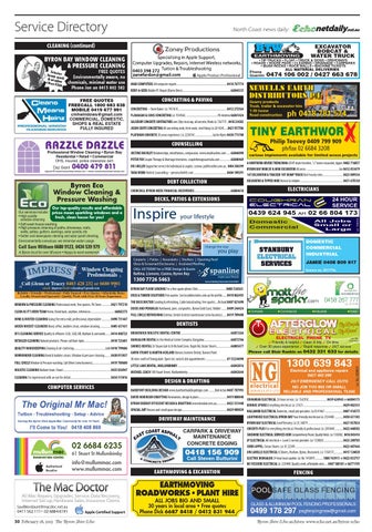 DETAILED CLEANING Natural products. Please call 8am-6pm......................................0410 723601 BANGALOW DENTAL In the Medical Centre Complex, Bangalow .....................................66872766 SHORES DENTAL Dr Shaun Goh & Dr Richard Conn. Rajah Rd, Ocean Shores....................66803477 QUALITY HOUSEKEEPING Cleaning & de-cluttering ............................................Julie 0410 799686 GAVIN STUART & MARTIN ACKLAND Banora Seaview Dental, Banora Point DOWNUNDER CLEANING Bond & builders cleans. Window & pressure cleaning .........0438 015037 30 mins north of Ewingsdale. Open Sat. early & late appointments ..............................07 55234090 FULL CIRCLE Window & Pressure washing. Call Oliver (new business)..........................0419 789600 LITTLE LANE DENTAL, MULLUMBIMBY ...........................................................................66842816 HOLISTIC CLEANING Mullum town. Dwari ...................................................................0435 836947 MICHAEL LEACH 100 Stuart Street, Mullumbimby ............................................................66842644 CLEANING I’m experienced with an eye for detail .........................................................0434 515016