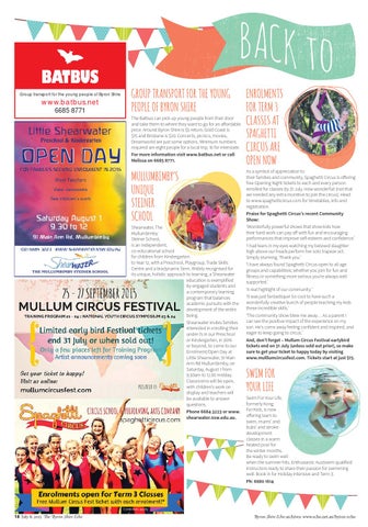 MULLUMBIMBY’S UNIQUE STEINER SCHOOL Shearwater, The Mullumbimby Steiner School, is an independent, co-educational school for children from Kindergarten to Year 12, with a Preschool, Playgroup, Trade Skills Centre and a biodynamic farm. Widely recognised for its unique, holistic approach to learning, a Shearwater education is exemplified by engaged students and a contemporary learning program that balances academic pursuits with the development of the entire being. Shearwater invites families interested in enrolling their under-7s in our Preschool or Kindergarten, in 2016 or beyond, to come to our Enrolment/Open Day at Little Shearwater, 91 Main Arm Rd Mullumbimby, on Saturday, August 1 from 9.30am to 12.00 midday. Classrooms will be open, with children’s work on display and teachers will be available to answer questions. Phone 6684 3223 or www. shearwater.nsw.edu.au.