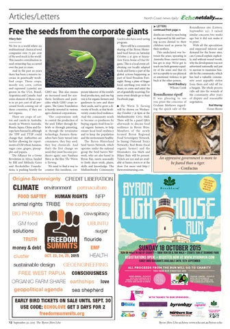 Garden also has a seed-saving program. There will be a community sharing of the Byron Hinterland Seed Savers on Saturday October 3 at 2pm at Sunnyview Farm, home of One Organic. This is a local event celebrating our locally adapted foods and forms a part of the global actions happening as part of Seed Freedom Fortnight. Bring a plate of finger food, anything you wish to share, or come and enjoy the art of gratefully receiving. For more event details go to their Facebook page. The Worm Is Turning will be shown on Wednesday October 7 at 6pm at the Mullumbimby Civic Hall. There will be a panel Q&A afterwards to discuss food resilience in Byron Shire. Members of the newly formed Byron Regional Food Sovereignty Network, Jo Immig (National Toxics Network), Rod Bruin (local organic farmer) and the filmmakers Asa Mark and Hilary Bain will be present. Tickets are $20 and are available at Santos stores or at the door. For more visit http:// thewormisturning.com. Q