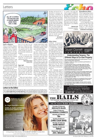 here, so, no, they are not blow-ins. I think the NIMBYs need to look past their own agenda and see what could actually be good for the whole shire with jobs and facilities. Or we can just say when you get to retirement age, ‘Fuck off ’; we don’t want or need you any more. Phil & Marie Boyd Suffolk Park