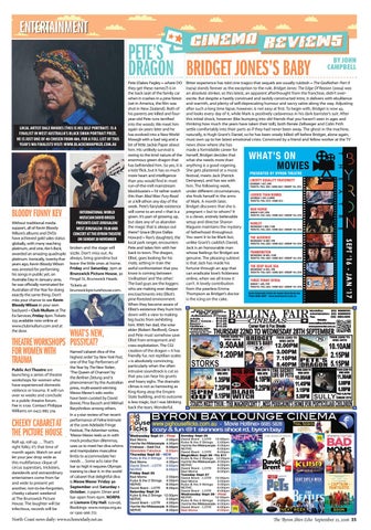 Bitter experience has told cine tragics that sequels are usually rubbish – The Godfather: Part II (1974) stands forever as the exception to the rule. Bridget Jones: The Edge Of Reason (2004) was an absolute stinker, so this latest, an apparent afterthought from the franchise, didn’t overexcite. But despite a hastily construed and tackily constructed intro, it delivers with ebullience and warmth, and plenty of self-deprecating humour and savvy satire along the way. Adjusting after such a long time lapse, however, is not easy at first. To begin with, Bridget is now 43, and looks every day of it, while Mark is positively cadaverous in his dark barrister’s suit. After this initial shock, however (like bumping into old friends that you haven’t seen in ages and thinking how much the years have taken their toll), both Renée Zellweger and Colin Firth settle comfortably into their parts as if they had never been away. The ghost in the machine, naturally, is Hugh Grant’s Daniel, so he has been wisely killed off before Bridget, alone again, must own up to her latest emotional crisis. Convinced by a friend and fellow worker at the TV news show where she has made a formidable career for herself, Bridget decides that what she needs more than anything is a good rogering. She gets plastered at a music PRESENTED BY BYRON THEATRE festival, meets Jack (Patrick LIBERTY EQUALITY FRATERNITY Dempsey), and has sex with SATURDAY 1 OCT, 3PM him. The following week, TICKETS: FULL $25 | CONC $23 | GROUP 10+ $15 under different circumstances, LOUDER THAN BOMBS she finds herself in the arms LOUDER SATURDAY 1 OCT, 6.30PM THAN TICKETS: FULL $15 | CONC $13 BOMBS of Mark. A month later, Bridget discovers that she is WAR HORSE pregnant – but to whom? It SUNDAY 9 OCT, 3PM TICKETS: FULL $25 | CONC $23 | GROUP 10+ $15 is a clever, entirely believable setup and director Sharon HAMLET WEDNESDAY 2 NOV, 11AM Maguire maintains the mystery TICKETS: FULL $25 | CONC $23 | GROUP 10+ $15 of fatherhood throughout. You want it to be Mark but, THE AUDIENCE WEDNESDAY 16 NOV, 1PM unlike Grant’s caddish Daniel, TICKETS: FULL $25 | CONC $23 | GROUP 10+ $15 Jack is an honourable man FRANKENSTEIN whose feelings for Bridget are WEDNESDAY 30 NOV, 11AM TICKETS: FULL $25 | CONC $23 | GROUP 10+ $15 genuine. The pleasing subtext is that Jack has made his THE DEEP BLUE SEA fortune through an app that WEDNESDAY 14 DEC, 1PM TICKETS: FULL $25 | CONC $23 | GROUP 10+ $15 can eradicate love’s fickleness online, when we all know it THREE PENNY OPERA SUNDAY 1 JAN, 1PM can’t. A lovely contribution TICKETS: FULL $25 | CONC $23 | GROUP 10+ $15 from the peerless Emma Byron Community Centre 69 Jonson Street Byron Bay Thompson as Bridget’s doctor Phone 6685 6807 | www.byroncentre.com.au is the icing on the cake. Â