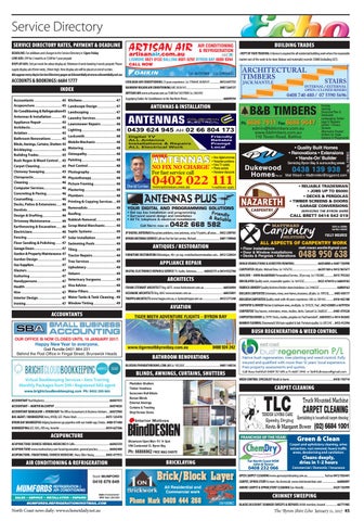 Service Directory DEADLINE: For additions and changes to the Service Directory is 12pm Friday LINE ADS: $99 for 3 months or $340 for 1 year prepaid DISPLAY ADS: $66 per week for colour display ad. Minimum 8 week booking 4 weeks prepaid. Please supply display ads 85mm wide, 28mm high. New display ads will be placed at end of section. Ads appear every day in Service Directory pages on Echonetdaily at www.echonetdaily.net.au