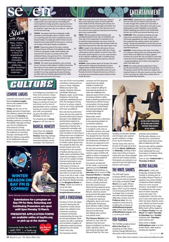 now one of the most-travelled comedians, having sold out rooms in Perth, Adelaide, Melbourne, Byron Bay, Sydney, Thailand, Vietnam, and Indigenous Australian. His Cambodia, Myanmar, Malaysia, Japan, South Korea, show Asms and Isms crosses Singapore, Hong Kong, over from the squirmy topics Lismore’s new annual comedy to the downright hilarious. Indonesia, Netherlands and festival Lismore Laughs Enjoy an evening of crazy fun USA. He manages to bring returns this weekend with humour to serious subjects and stories such as how to three great shows. appropriately name a cyclone, such as war crimes, genocide Friday see the star of The buying cars without upsetting and mass surveillance. Weekly and host of Hard Quiz, your wife, and growing Not only has he performed Tom Gleeson present his show up poor. Saunders’s star is shows all over the world; he Cheer Up and Saturday at definitely on the rise. has also performed at peace lunchtime the wacky Frank festivals in the Middle East For enquiries go to norpa. Woodley performs comedy for org.au or call 1300 066 772. and Northern Ireland; he the kiddies. Saturday evening performed as a ‘highlight’ at sees the hit of Melbourne Glastonbury Festival 2016. International Comedy A grassroots comedian and Festival, Andy Saunders, take people-lover, he is Ireland’s Direct from the Adelaide the audience on a journey only comedian to have done a Fringe festival is Radical through a landscape of his sitting-room tour of Ireland or Honesty, featuring standup life from hilarious anecdotes to leave the stage at Electric comedian Aidan Killan, an of his childhood to life as a Picnic, Irelands largest festival, investment banker turned father, husband, comedian to initiate a giant group hug. comedian. This Irishman is He is joined by Nick Sun, the unique Aussie comic who emerged from the suburbs of Sydney during 2004. In a stellar career acceleration Nick made the prestigious, inviteonly Just For Laughs Comedy Festival at Montreal in 2005 and returned to the UK for a full season of shows at Edinburgh. This previous RAW comedy national champion also went on to take out the comp in the UK as well – a feat not achieved before. The two join forces for Radical Honesty at the Bangalow Bowlo on Friday. Tickets $20 online or $25 at the door.