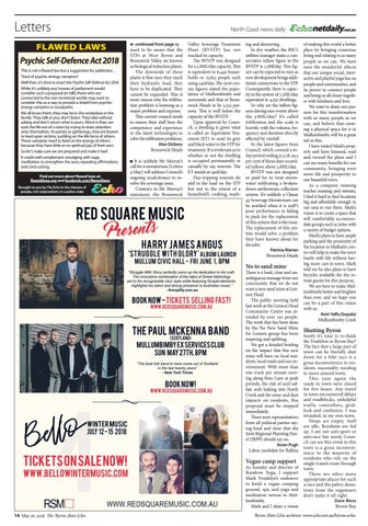 ing and showering. In dry weather, the BSC’s utilities manager states a conservative inflow figure to the BVSTP is 1.3Ml/day. This figure can be expected to vary as new development brings additional connections to the STP. Consequently, there is capacity in the system of 2.5ML/day equivalent to 4,237 dwellings. So why are the inflow figures during rain events above the 3.8ML/day? It’s called infiltration and the scale is horrific with the volume, frequency and duration directly affected by rainfall. In the latest figures from Council, which covered a 61day period ending 31.3.18, 29.5 per cent of those days recorded inflows above 3.8ML/day. BVSTP was not designed or paid for to treat stormwater infiltrating a brokendown earthenware collection system. It’s unlikely a Clause 45 Sewerage Moratorium can be justified when it is staff ’s poor performance in failing to push for the replacement of this system that is the issue. The replacement of this system would solve a problem they have known about for decades. Patricia Warren Brunswick Heads