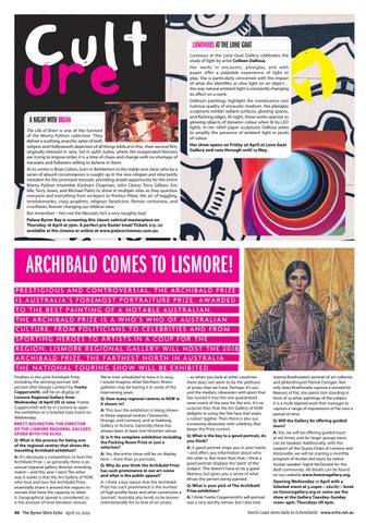 ARCHIBALD COMES TO LISMORE! PRESTIGIOUS AND CONTROVERSIAL, THE ARCHIBALD PRIZE IS AUSTRALIA’S FOREMOST PORTRAITURE PRIZE. AWARDED TO THE BEST PAINTING OF A NOTABLE AUSTRALIAN, THE ARCHIBALD PRIZE IS A WHO’S WHO OF AUSTRALIAN CULTURE, FROM POLITICIANS TO CELEBRITIES AND FROM SPORTING HEROES TO ARTISTS.IN A COUP FOR THE REGION, LISMORE REGIONAL GALLERY WILL HOST THE 2018 ARCHIBALD PRIZE, THE FARTHEST NORTH IN AUSTRALIA THE NATIONAL TOURING SHOW WILL BE EXHIBITED. Finalists in the 2018 Archibald Prize, including the winning portrait Selfportrait after George Lambert by Yvette Coppersmith, will be on display at Lismore Regional Gallery from Wednesday 18 April till 16 June. Yvette Coppersmith will be in Lismore to open the exhibition at a ticketed Gala Event on Wednesday. BRETT ADLINGTON, THE DIRECTOR OF THE LISMORE REGIONAL GALLERY, SPOKE WITH THE ECHO. Q: What is the process for being one of the regional centres that shows the travelling Archibald exhibiton? A: It’s obviously a competition to host the Archibald Prize – so generally there is an annual regional gallery director wrestling match – and this year I won! The other way it works is that the Art Gallery of NSW, who host and tour the Archibald Prize, essentially share it around the regions to venues that have the capacity to show it. Geographical spread is considered, as is the amount of time between venues.