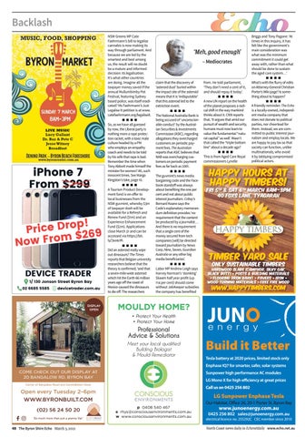 Backlash NSW Greens MP Cate Faehrmann’s bill to legalise cannabis is now making its way through parliament. And because we are led by the smartest and best among us, the result will no doubt be a mature and informed decision: its legalisation. It’s what other countries are doing. Imagine all the taxpayer money saved if the annual Mullumbimby Pot Festival, featuring Sydney based police, was itself eradicated? Ms Faehrmann’s Just Legalise It petition is at www. catefaehrmann.org/legaliseit. Q Q Q Q