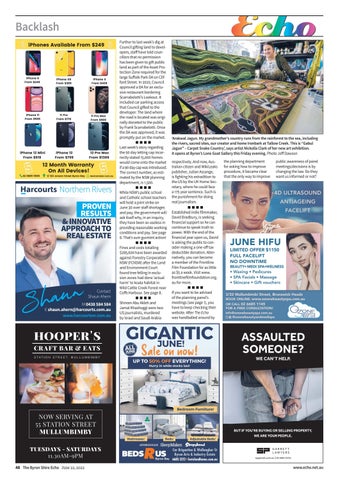 ‘Arakwal Jagun. My grandmother’s country runs from the rainforest to the sea, including the rivers, sacred sites, our creator and home Ironbark at Tallow Creek. This is “Gabul Jagun” – Carpet Snake Country’, says artist Nickolla Clark of her new art exhibition. It opens at Byron’s Lone Goat Gallery this Friday evening. Photo Jeff Dawson respectively. And now, Australian citizen and WikiLeaks publisher, Julian Assange, is fighting his extradition to the US by the UK Home Secretary, where he could face a 175 year sentence. Such is the punishment for doing real journalism. Established indie filmmaker, David Bradbury, is seeking financial support so he can continue to speak truth to power. With the end of the financial year upon us, David is asking the public to consider making a one-off tax deductible donation. Alternatively, you can become a member of the Frontline Film Foundation for as little as $5 a week. Visit www. frontlinefilmfoundation.org. au for more. If you want to be advised of the planning panel’s meetings (see page 1), you have to keep checking their website. After The Echo was handballed around by