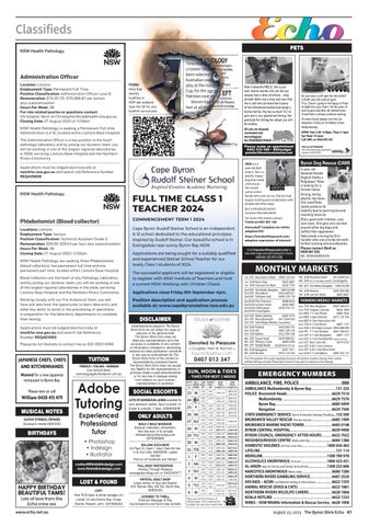 INDEPENDENT LOCALLY OWNED ORGAN OF NEWS AND ADS SINCE 1986 The Byron Shire Echo • Volume 38 #11 • August 23, 2023 • www.echo.net.au J onson Street, Byron Bay • 02 6685 6878 • www.byronbayservicesclub.com.au THE BEST VALUE & COLDEST BEERS IN TOWN! Home and garden ideas to make your space ▶ p21 Fire up it’s footy finals time ▶ p43 Edward Herring returns! ▶ p12 Main Arm residents found safe after being lost at sea ▶ p5 Richard Jones has a vision ▶ p10