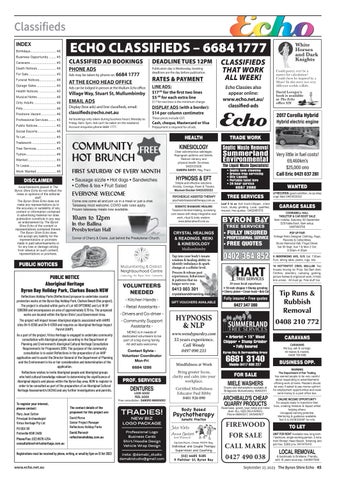 ESSE EST PERCIPI – BISHOP GEORGE BERKELEY (1685–1753) The Byron Shire Echo • Volume 38 #16 • September 27, 2023 • www.echo.net.au Jonson Street, Byron Bay • 02 6685 6878 • www.byronbayservicesclub.com.au The school holidays roll on ▶ p21 Lessons from the 1967 referendum ▶ p16 Byron’s A&I abuzz with creativity ▶ p24 Feros slaps ban on media visits ▶ p11 Homeless hub forced to cut vital services ▶ p2 A short history of cruelty ▶ p12