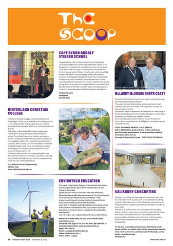 $15k value - fully funded Diploma of Sustainable Operations. Only five spots left for Byron Shire residents face-to-face classes in Byron Bay. Upskill yourself and your business with their MSS50122 Diploma in Sustainable Operations course! The comprehensive curriculum covers the pillars of sustainability - from environmental impacts management and stewardship to social responsibility and economic feasibility. Learn how to integrate and implement environmental, social and economic considerations into your business to ensure operations in a manner that is consistent with sustainable development. Learn to reduce your impact today and make a better future. Reach out to them today, 07 5535 3766 or email info@ envirotech.edu.au Check the back page of The Echo for direct QR code link to enrolment information. www.envirotech.edu.au Apply: ikon.Edu.Au Email: courseadvisor@ikon.Edu.Au Phone: 1300 613 801 (ext 1) Online and on campus