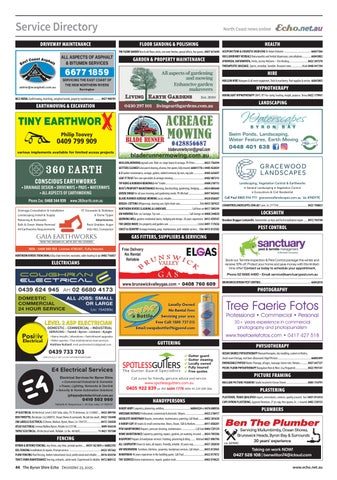 FENCING BYRON & BEYOND FENCING. Any fence, any time, prompt quotes .....0439 162 069 or 66802393 EDL FENCING Installations & repairs. Prompt service. ..................................................0432 107262 FLOW FENCING Pool fencing, timber/colourbond, local, professional and reliable.......0416 424256 TOM’S FARM MAINTENANCE Fencing, orchards, cattle work. Experienced & reliable. 0412 860132