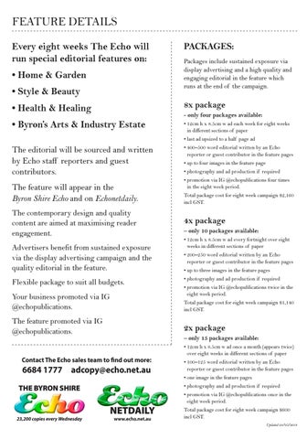 • 12cm h x 8.5cm w ad once a month (appears twice) over eight weeks in different sections of paper • 100–125 word editorial written by an Echo reporter or guest contributor in the feature pages • one image in the feature pages • photography and ad production if required