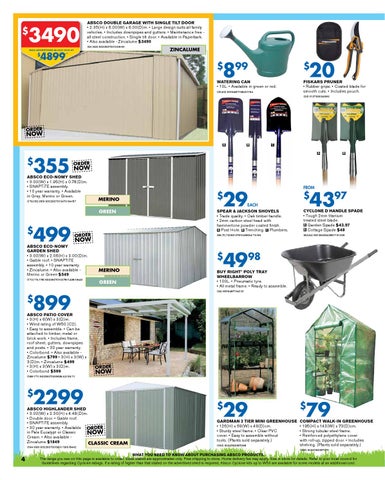 Absco Highlander Shed • 3.00(W) x 2.30(H) x 4.48(D)m. • Double door. • Gable roof. • SNAPTiTE assembly. • 30 year warranty. • Available ORDER in Pale Eucalypt or Classic NOW Cream. • Also available Zincalume $1849 CLASSIC CREAM (164-166) 9322927005601/595/8442