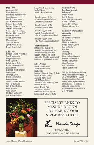 Endowment Gifts have been received in honor of: Debbie Altman Lois R. Beznos Carol & Ricky Blumenstein Barbara Klarman Andrea & David Page Marjorie & Harold Victor Endowment Gifts have been received in memory of: M. Lawrence Applebaum Pearle Baskin Marvin H. Bookstein Rose & Richard Cooper Fred M. Ginsberg Karl Haas Sol Iwrey Wendy Joyrich Linda Hoffman Kozlowski Norman D. Kloosterman Milton J. (Jack) Miller Albert Rosenthal O. D. Silverstein Toba & Bert Smokler This list of reflects contributions of $50 or more received March 14, 2012 through March 14, 2013. The Chamber Music Society of Detroit deeply regrets any errors or omissions. For questions or concerns, please call the Chamber Music Society office at 248-737-9980.