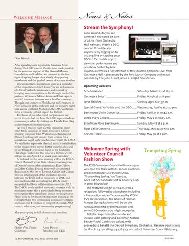 Dear Friends, After spending nine days in the Sunshine State during the DSO’s recent Florida tour, made possible by the generous support of the General Motors Foundation and Cadillac, we returned to the first signs of spring: longer days, slowly disappearing snowbanks and the gradual return of warmer weather. Our recent travel experiences serve as a reminder of the importance of such tours. We are ambassadors of Detroit’s rebirth, renaissance and renewal by bringing our communities to life through music. Our partners at General Motors know well that exports are vital to robust business and a healthy economy. Through our journey to Florida, our performances in New York, our global webcasts and our concerts right here across southeast Michigan, the DSO continues to be a valuable cultural export for Detroit. For those of you who could not join us on our recent travels, find out how the DSO represented our community’s values by visiting our Florida Tour blog at detroitsymphony.tumblr.com. As you’ll read on page 10, this spring has many other fresh initiatives in store. On June 14, Oscarwinning composer John Williams and film legend Steven Spielberg will donate their services for a special one-night-only benefit concert with the DSO. No one better represents classical music’s contribution to the magic of the movies better than this duo, and we are thrilled to welcome them to the Orchestra Hall stage. Tickets for this once in a lifetime event will go on sale April 14, so mark your calendars! Scheduled for the same evening will be the DSO’s Fourth Annual Heroes Gala Dinner, honoring two of Detroit’s most ardent champions, Dan Gilbert and Matt Cullen. Beyond their well-documented dedication to the city of Detroit, Gilbert and Cullen were an integral part of the mediation process between the DSO and its musicians in 2011, and were instrumental in creating the DSO’s wildly successful Kid Rock collaboration concert in 2012. The DSO’s newly ratified three-year contract with its musicians makes this a particularly fitting moment to recognize their significant impact on this process. Please join us for this most important evening as we celebrate these two outstanding community citizens and raise over $1 million in support of crucial DSO concert, education, and community programming! May your spring be full of music and sunshine!