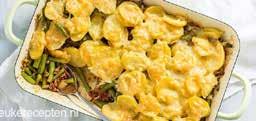 3. Schep de boontjes door het gehaktmengsel. Doe het vervolgens in een ingevette ovenschaal. Verdeel de aardappelschijfjes er over. Bestrooi met kaas en zet ca. 30 minuten in de oven.