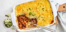 6. Schep het mengsel in een ingevette ovenschaal. Dek de bovenzijde af met de aardappelpuree en bestrooi met kaas.