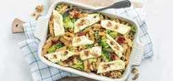 3. Vet een ovenschaal in. Verdeel de helft van het pasta-broccoli mengsel over de bodem. Snijd de brie in plakjes en leg de helft hiervan op de pasta en broccoli. Dek af met de rest van het pastamengsel. Dek af met de rest van de plakjes brie. Bestrooi eventueel nog met wat extra walnoten.